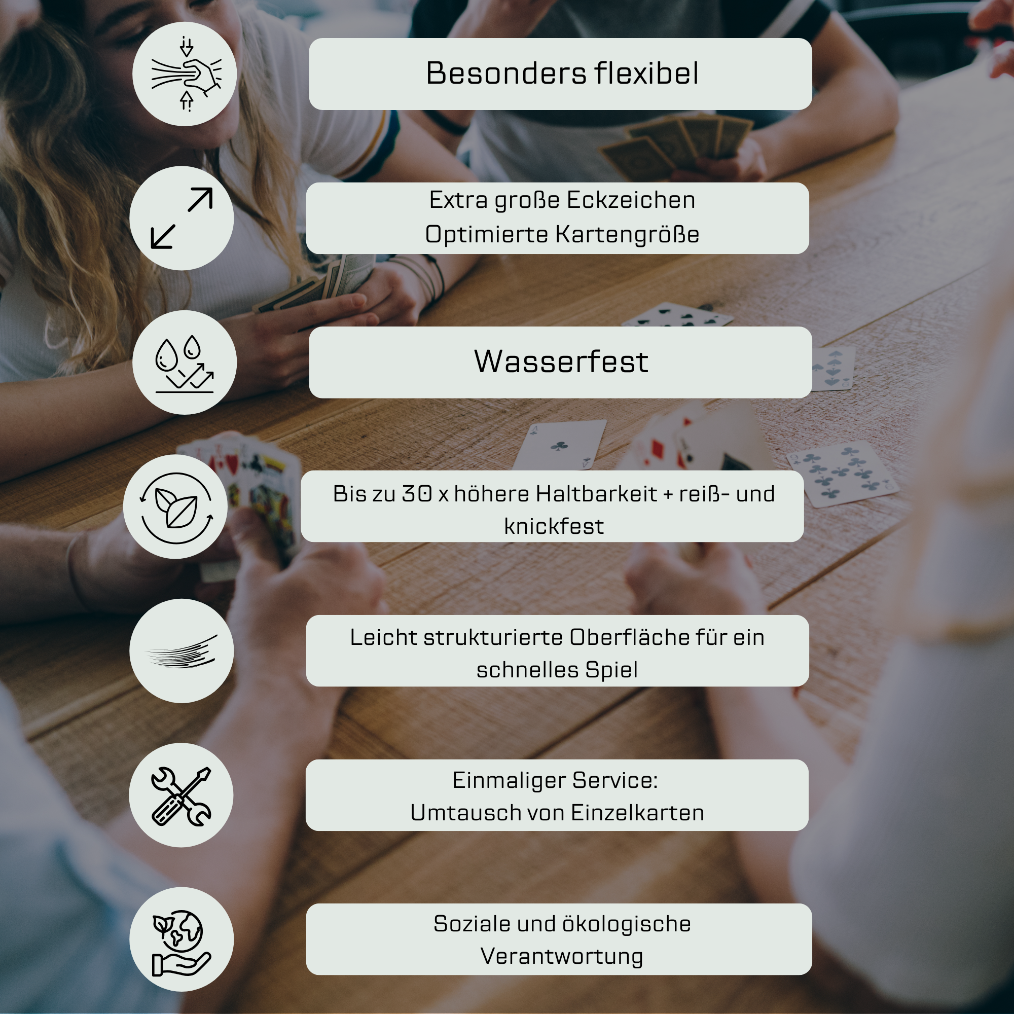 Im Vergleich zu Papier- oder Leinenkarten sind sie bis zu 30 × haltbarer – perfekt für regelmäßige Spielrunden, Vereinsabende oder den Einsatz unterwegs.
